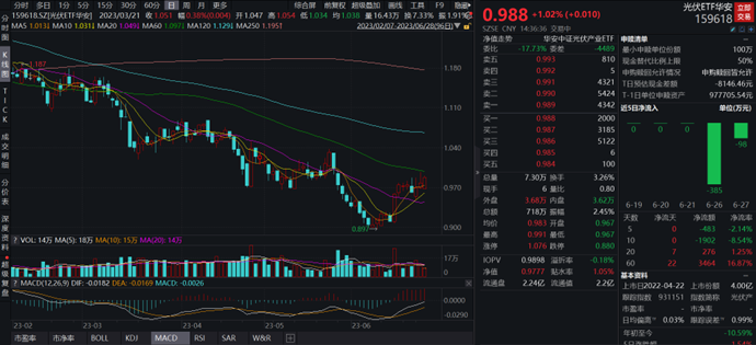 截至14:36分,光伏ETF华安(159618)午后开盘持续上涨已达1.02%。
