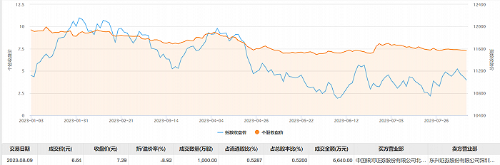 8月9日大宗交易成交1000万股,成交额6640万元,占当日总成交额的42.08%,成交价6.64元,较市场收盘价7.29元折价8.92%。
