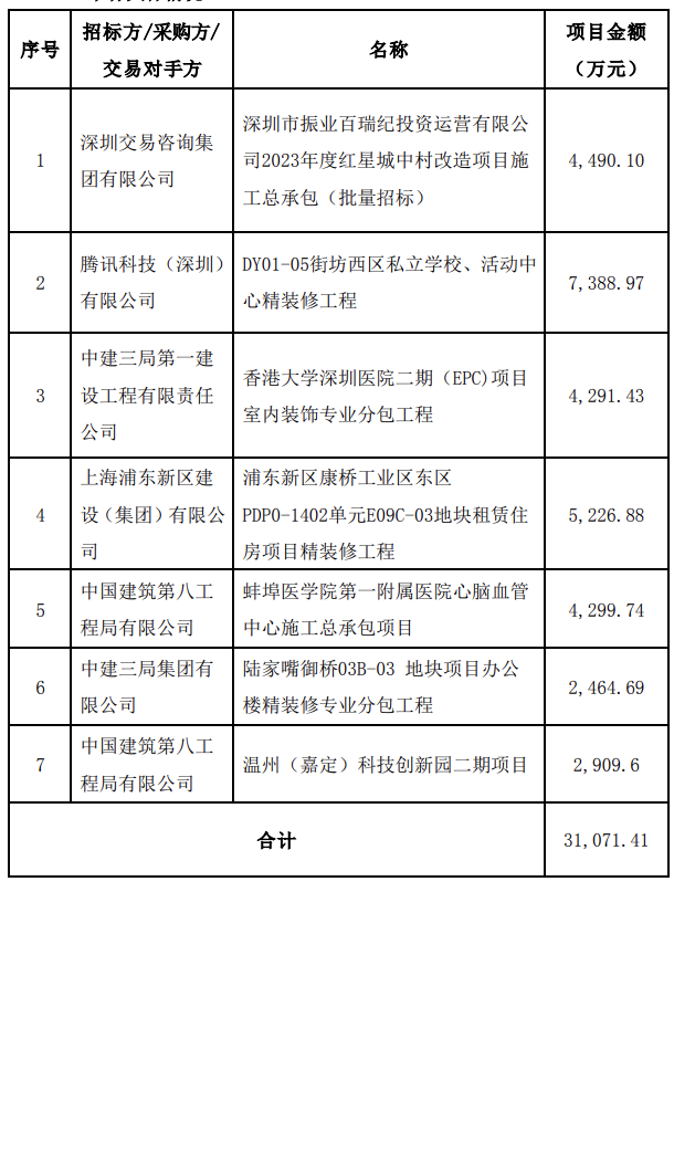 瑞和股份11月2日公告,公司于近期收到中建三局第一建设工程有限责任公司、上海浦东新区建设(集团)有限公司、中国建筑第八工程局有限公司、中建三局集团有限公司等企业与公司签订的工程施工合同;深圳交易咨询集团有限公司、腾讯科技(深圳)有限公司等招标单位给公司发出的《中标通知书》。