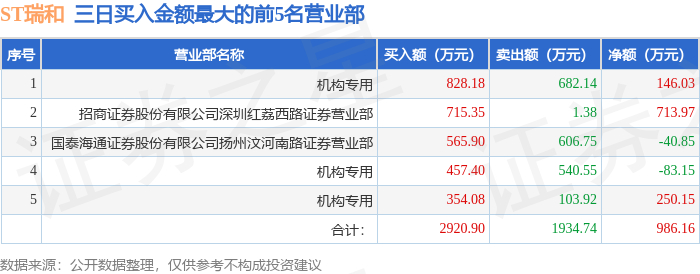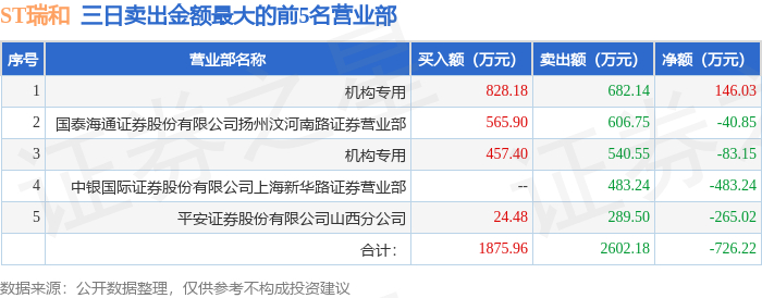 9月26日ST瑞和(002620)龙虎榜数据:机构净买入313.04万元(3日)