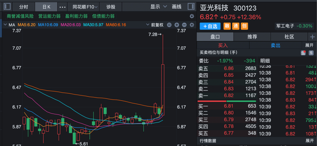 军工股震荡拉升,亚光科技一度触及“20cm”涨停,最新涨幅为12.36%;江龙船艇涨超10%,北方长龙、国瑞科技、天海防务、天和防务等纷纷冲高。机构研报指出,从业绩角度来看,军工板块季度报表已显示出逐季改善趋势。