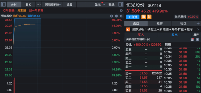 盘初,磷化工板块拉升,恒光股份“20cm”涨停,川能动力涨停,澄星股份、云图控股跟涨。