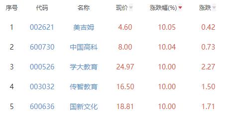 其中,美吉姆、中国高科、学大教育、传智教育、国新文化位列板块涨幅前五位,涨幅分别为10.05%、10.04%、10.00%、10.00%、10.00%。