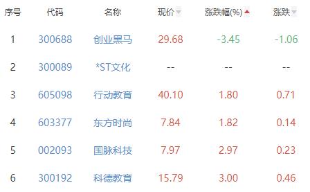 创业黑马、行动教育、东方时尚、国脉科技、科德教育位列涨幅榜后五位,涨幅分别为-3.45%、1.80%、1.82%、2.97%、3.00%。