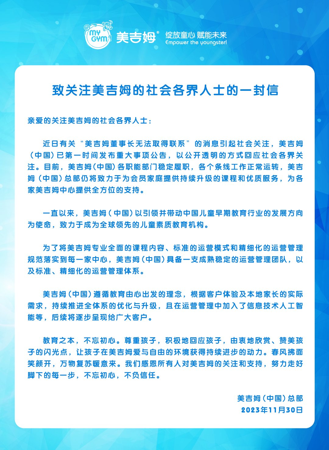 发文表示,近日有关“美吉姆董事长无法取得联系”的消息引起社会关注。目前,美吉姆(中国)各职能部门稳定履职,各个条线工作正常运转。