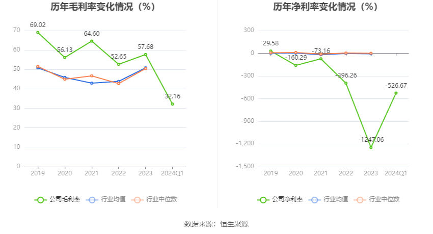 2024年第一季度,公司毛利率为32.16%,同比下降20.38个百分点;净利率为-526.67%,较上年同期下降481.78个百分点。