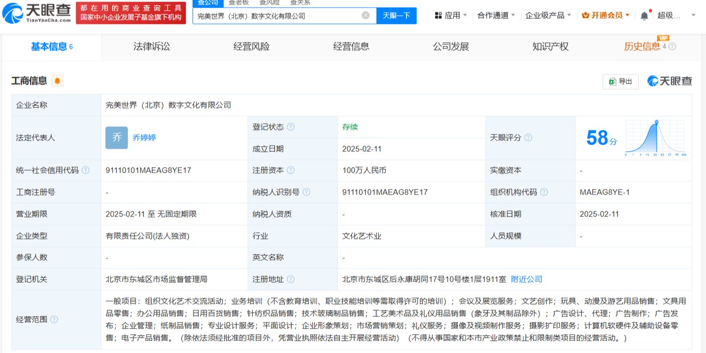 天眼查App显示,近日,完美世界(北京)数字文化有限公司成立,法定代表人为乔婷婷,注册资本100万人民币,经营范围包括组织文化艺术交流活动、日用百货销售、电子产品销售等。股东信息显示,该公司由完美世界游戏有限责任公司全资持股。