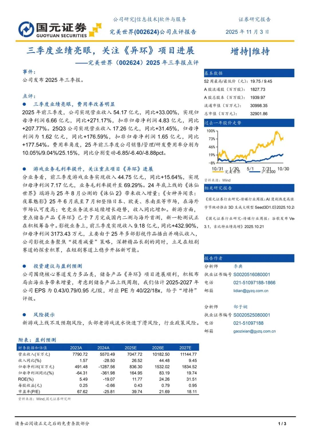 本报告摘自国元证券2025年11月3日已发布的《三季度业绩亮眼,关注《异环》项目进展——完美世界(002624)2025年三季报点评》,具体报告及分析内容请详见报告。若因对报告的摘编等产生歧义,应以报告发布当日的完整内容为准。