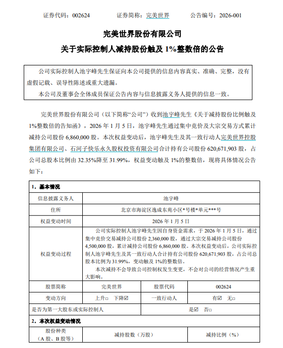1月5日晚间,完美世界(002624.SZ)公告,公司收到实际控制人池宇峰《关于减持股份比例触及1%整数倍的告知函》,2026年1月5日,池宇峰通过集中竞价及大宗交易方式累计减持公司股份686万股。本次权益变动后,池宇峰及其一致行动人完美世界控股集团有限公司、石河子快乐永久股权投资有限公司合计持有公司股份620,671,903股,占公司总股本比例由32.35%降至31.99%。池宇峰减持原因为自身资金需求。
