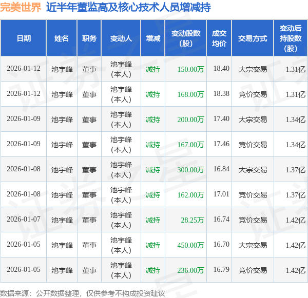 完美世界:1月12日高管池宇峰减持股份合计318万股
