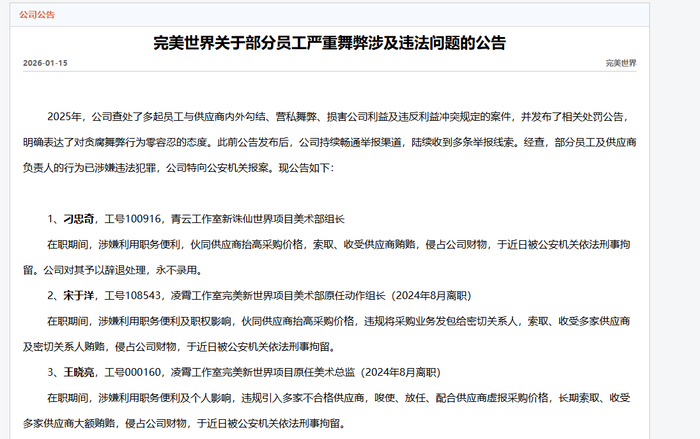 公告提到,2025年完美世界查处了多起员工与供应商内外勾结、营私舞弊、损害公司利益的案件,公告发布后陆续收到多条新的举报线索。经进一步核查确认,部分员工及供应商负责人的行为已涉嫌违法犯罪。