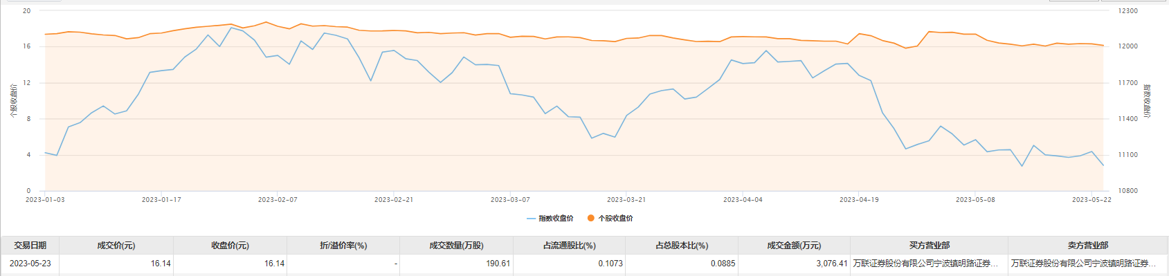 5月23日大宗交易成交190.61万股,成交额3076.41万元,占当日总成交额的16.04%,成交价16.14元,较市场收盘价16.14元持平。