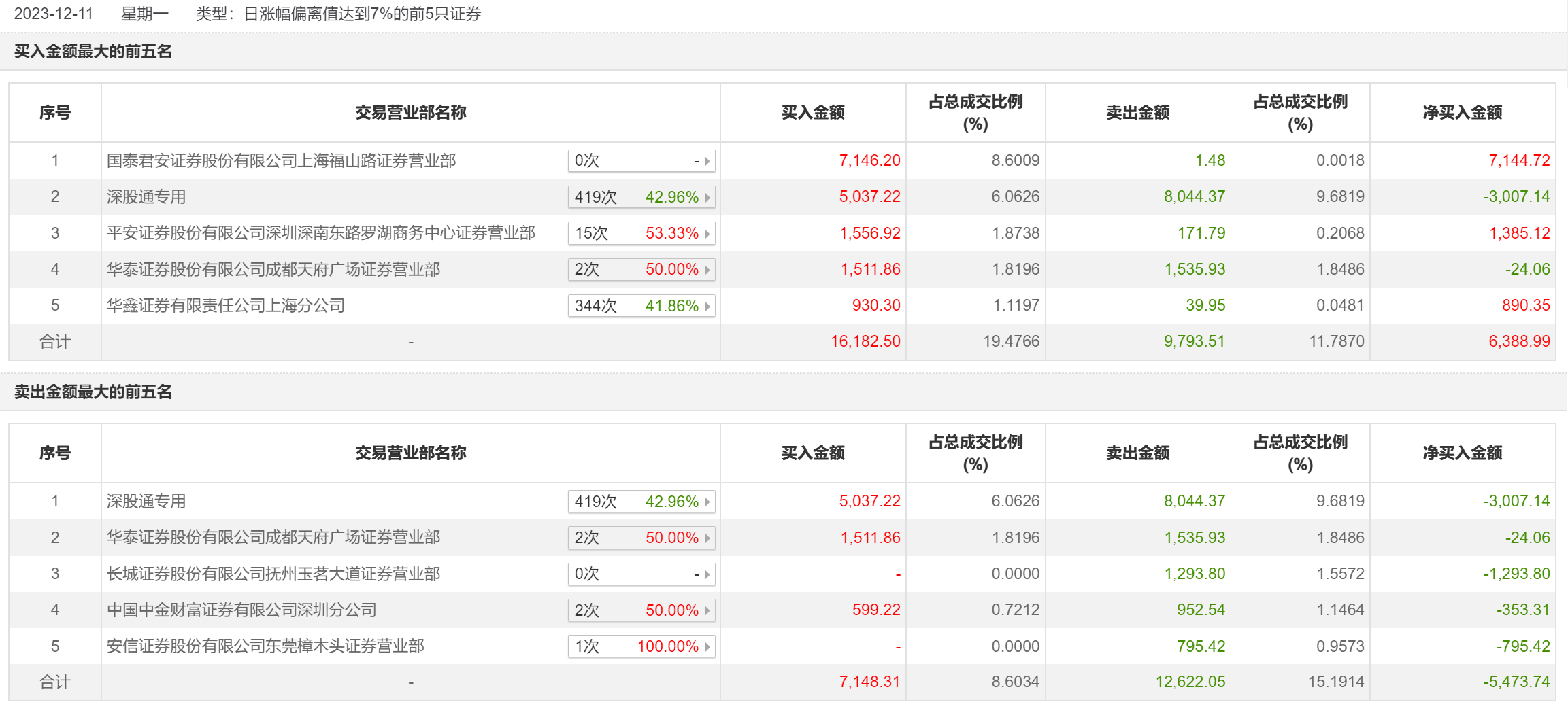 12月11日,光启技术今日涨停,全天换手率达3.26%,振幅达7.5%。龙虎榜数据显示,营业部席位合计净买入3946.46万元。其中,国泰君安证券上海福山路证券营业部、深股通专用分别买入7146.20万元、5037.22万元;深股通专用、华泰证券成都天府广场证券营业部分别卖出8044.37万元、1535.93万元。