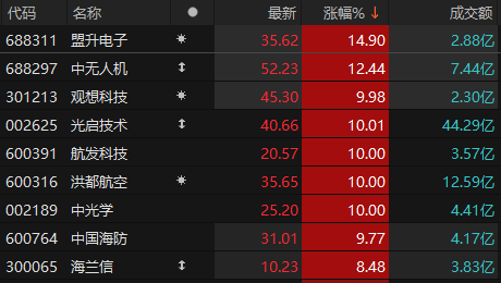 上证报中国证券网讯 10月23日上午交易时段,国防军工板块持续走强。截至10时21分,光启技术、航发科技、洪都航空、中光学涨停。盟升电子涨近15%,中无人机涨超12%,观想科技、中国海防等跟涨。
