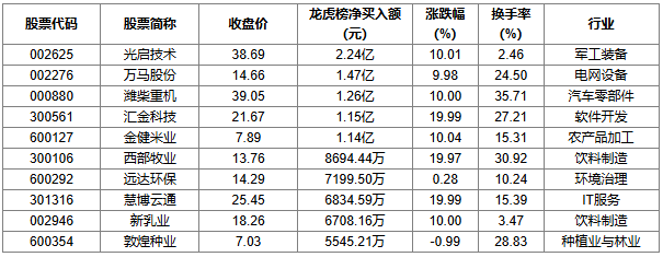 4月10日龙虎榜出炉,光启技术、万马股份、潍柴重机为当日龙虎榜净买入额前三,分别为2.24亿元、1.47亿元、1.26亿元。
