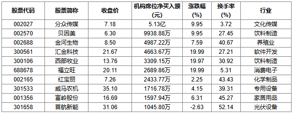 龙虎榜中涉及机构专用席位的个股中,当日净买入额前三为分众传媒、贝因美、金河生物,分别为5.13亿元、9938.88万元、4987.22万元。