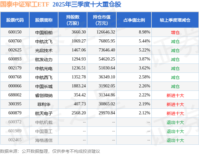 根据2025基金Q3季报公募基金重仓股数据,重仓该股的公募基金共26家,其中持有数量最多的公募基金为国泰基金的国泰中证军工ETF。国泰中证军工ETF目前规模为141.09亿元,最新净值1.5015(1月8日),较上一交易日上涨4.22%,近一年上涨55.58%。该公募基金现任基金经理为艾小军。艾小军在任的基金产品包括:国泰金融ETF联接A,管理时间为2014年1月13日至今,期间收益率为184.5%;国泰上证180金融ETF,管理时间为2014年1月13日至今,期间收益率为206.82%;国泰黄金ETF,管理时间为2014年1月13日至今,期间收益率为290.73%;国泰中证计算机主题ETF联接A,管理时间为2015年3月26日至今,期间收益率为2.62%。