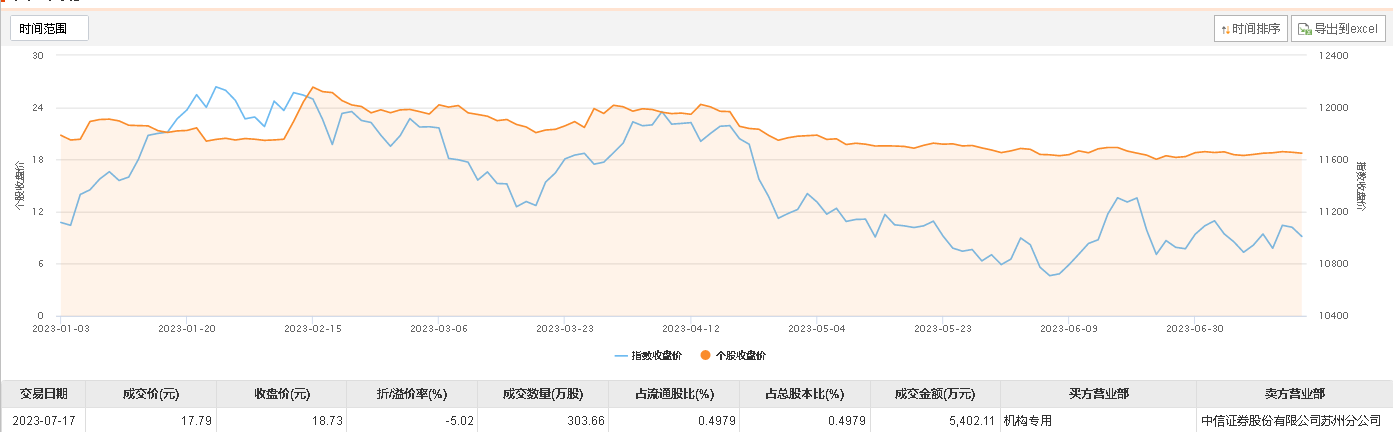 7月17日大宗交易成交303.66万股,成交额5402.11万元,占当日总成交额的60.33%,成交价17.79元,较市场收盘价18.73元折价5.02%。