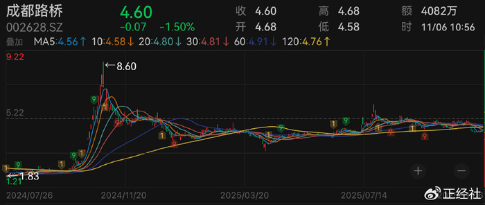二级市场上,林晓晴连任董事长的背景下,11月3日、4日,成都路桥股价分别上涨0.89%、下降0.66%;11月5日,大涨3.78%,股价为4.67元/股,市值为35.36亿元。【《正经社》出品】