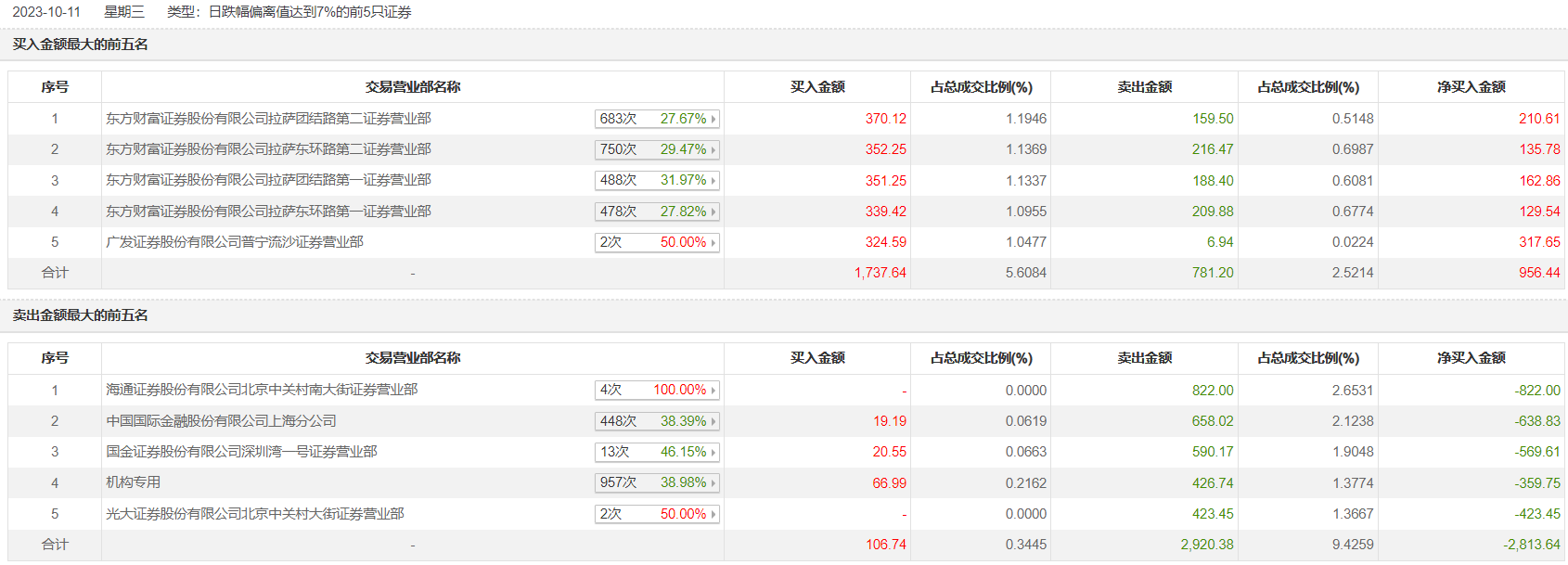 10月11日,仁智股份今日跌停,全天换手率达21.06%,振幅达2.19%。龙虎榜数据显示,营业部席位合计净卖出1857.2万元。其中,机构买入66.99万元,卖出426.74万元,合计净卖出359.75万元。此外,海通证券北京中关村南大街证券营业部、中国国际金融上海分公司分别卖出822.00万元、658.02万元;东方财富证券拉萨团结路第二证券营业部、东方财富证券拉萨东环路第二证券营业部分别买入370.12万元、352.25万元。
