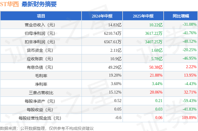 ST华西(002630)2025年中报简析:净利润同比下降41.76%,三费占比上升明显