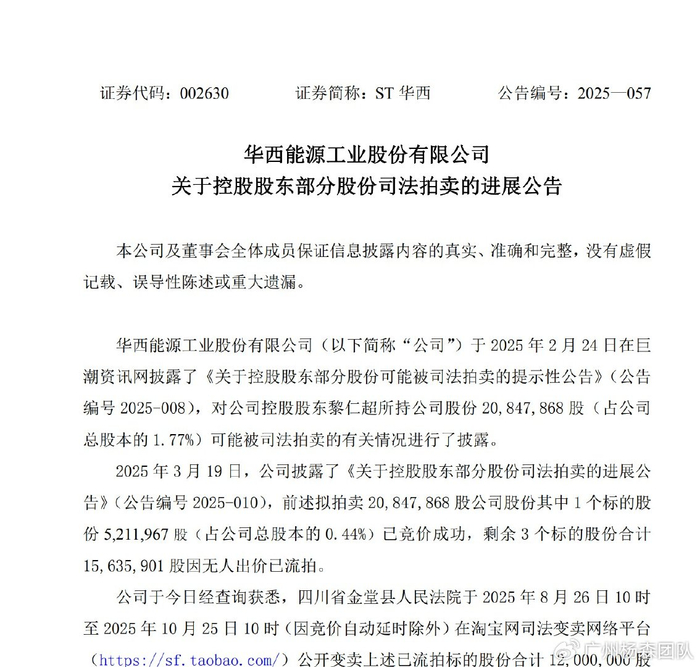 2025年8月28日,华西能源002630披露关于控股股东部分股份司法拍卖的进展公告。