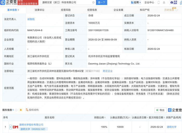 企查查APP显示,近日,道明交安(浙江)科技有限公司成立,注册资本1亿元,经营范围包含:太阳能热利用产品销售;太阳能热发电产品销售;交通安全、管制专用设备制造等。企查查股权穿透显示,该公司由道明光学(002632)全资持股。