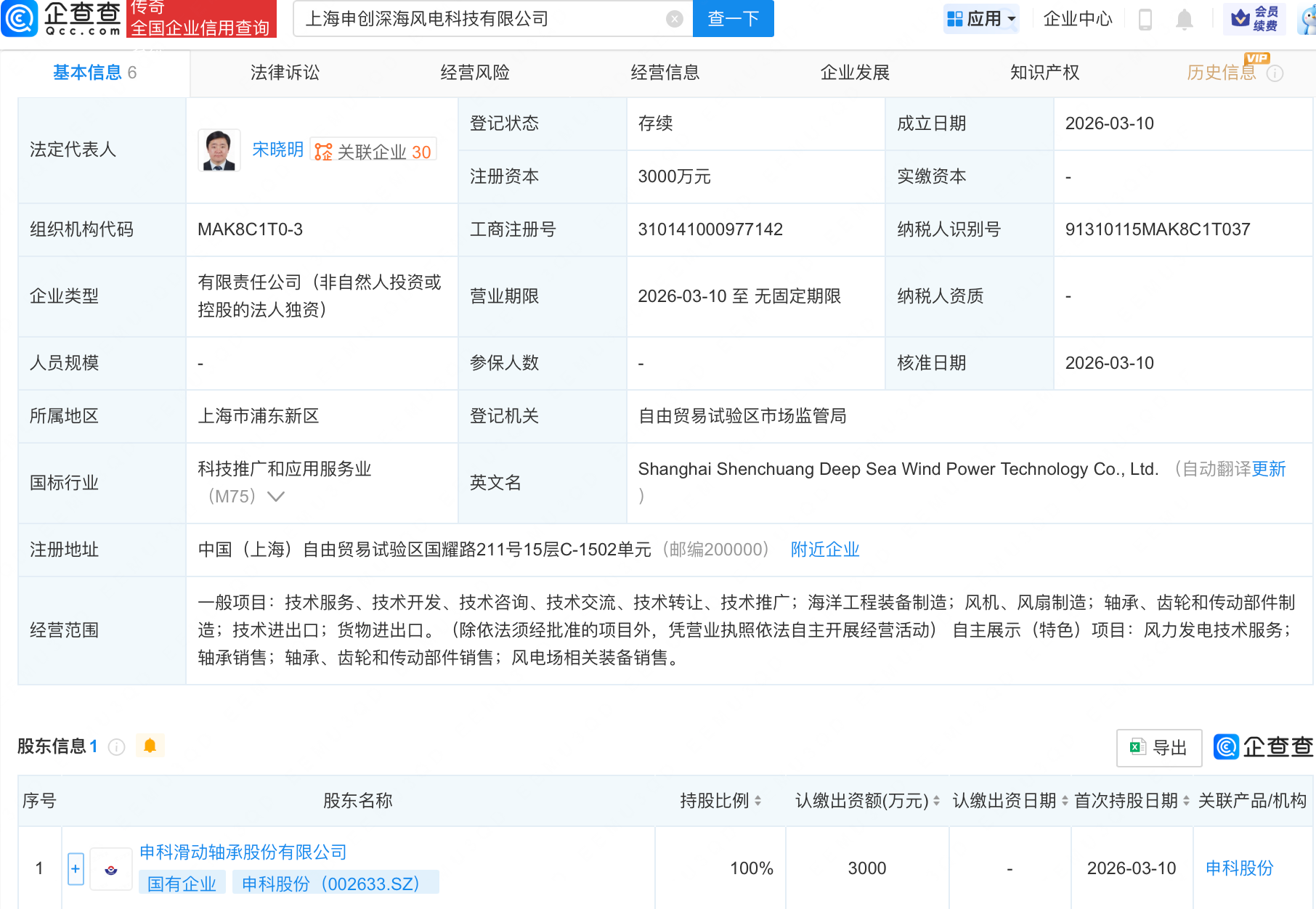 企查查APP显示,近日,上海申创深海风电科技有限公司成立,注册资本3000万元,经营范围包含:海洋工程装备制造;风机、风扇制造;轴承、齿轮和传动部件制造;技术进出口等。企查查股权穿透显示,该公司由申科股份(002633.SZ)全资持股。