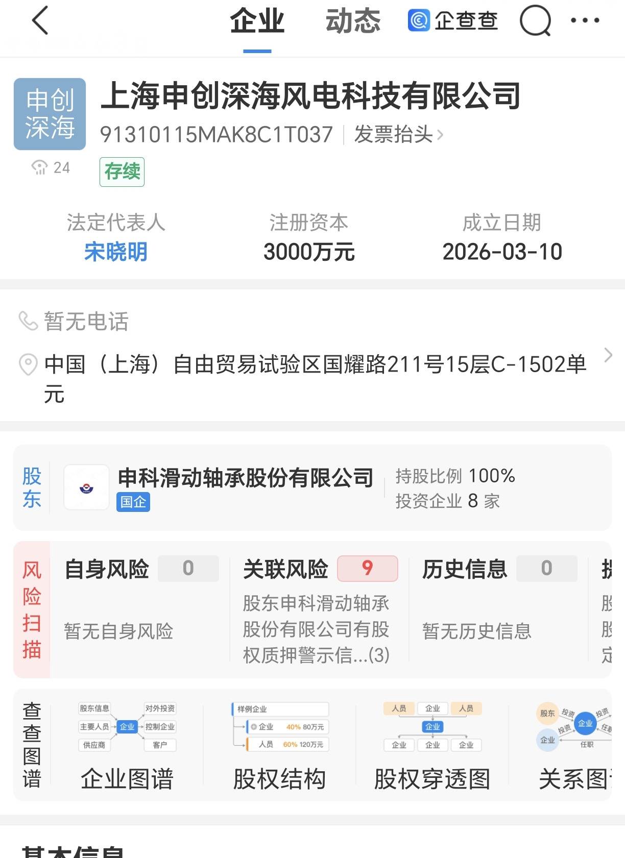 上证报中国证券网讯(记者 秦春刚)3月10日,记者从企查查获悉,上海申创深海风电科技有限公司成立,法定代表人为宋晓明,注册资本为3000万元,注册地址位于上海浦东。公司由申科滑动轴承股份有限公司(简称“申科股份”)100%持股。