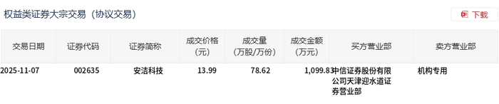 11月7日,安洁科技大宗交易成交78.62万股,成交额1099.83万元,占当日总成交额的14.72%,成交价13.99元,较市场收盘价13.99元持平。