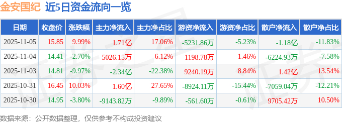 11月5日的资金流向数据方面,主力资金净流入1.71亿元,占总成交额17.06%,游资资金净流出5231.86万元,占总成交额5.23%,散户资金净流出1.18亿元,占总成交额11.83%。