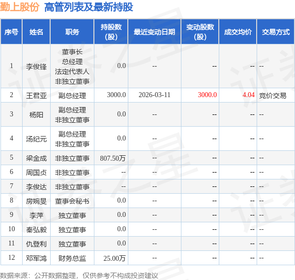 勤上股份的高管列表及最新持股情况如下: