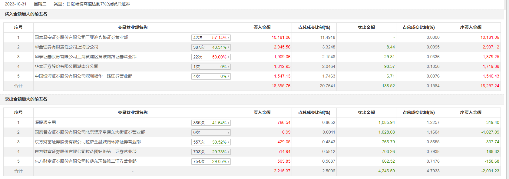 10月31日,跨境通今日涨停,全天换手率达14.97%,振幅达12.19%。龙虎榜数据显示,营业部席位合计净买入1.62亿元。其中,国泰君安证券三亚迎宾路证券营业部、华鑫证券上海分公司分别买入1.02亿元、2945.56万元;深股通专用、国泰君安证券北京望京阜通东大街证券营业部分别卖出1085.94万元、1028.08万元。