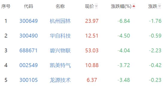 杭州园林、华自科技、碧兴物联、凯美特气、龙源技术位列涨幅榜后五位,涨幅分别为-6.84%、-4.50%、-4.04%、-3.72%、-3.48%。