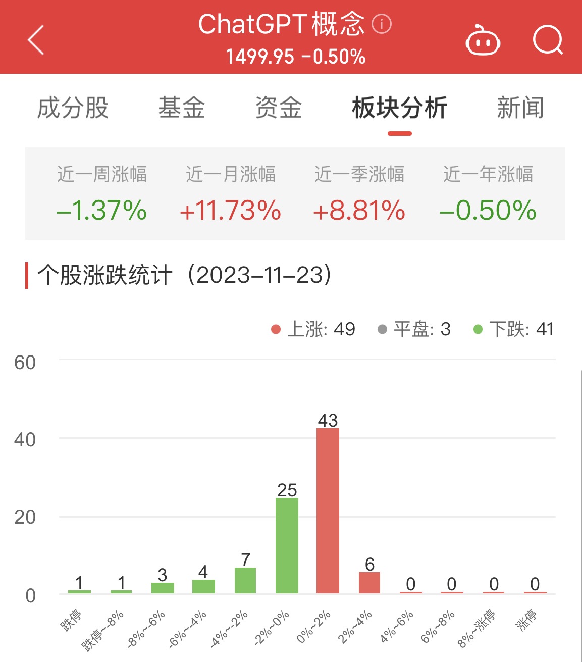 中国经济网北京11月23日讯今日,ChatGPT概念板块整体涨幅-0.50%,其中49只股票上涨,3只股票平盘,41只股票下跌。