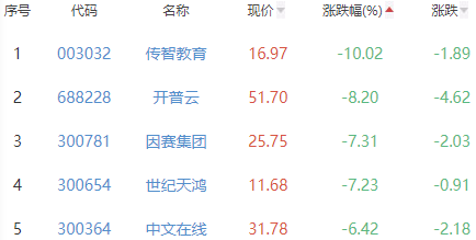 传智教育、开普云、因赛集团、世纪天鸿和中文在线位列涨幅榜后五位,涨幅分别为-10.02%、-8.20%、-7.31%、-7.23%和-6.42%。