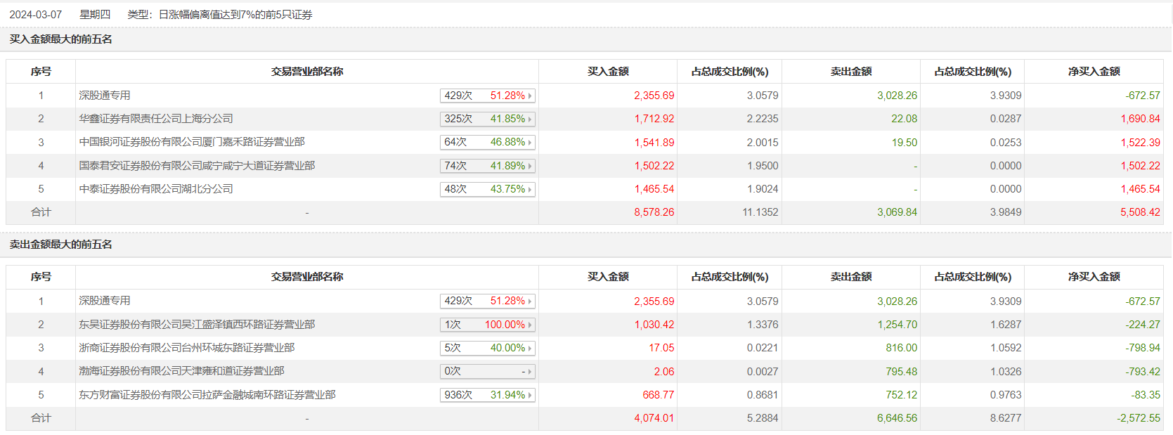 具体来看,深股通专用、华鑫证券上海分公司分别买入2355.69万元、1712.92万元;深股通专用、东吴证券吴江盛泽镇西环路证券营业部分别卖出3028.26万元、1254.70万元。