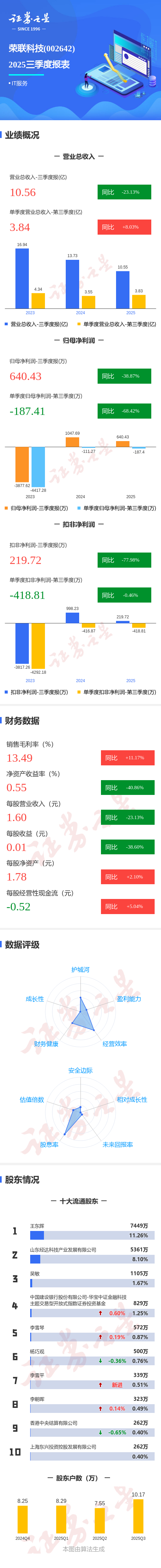 图解荣联科技三季报:第三季度单季净利润同比下降68.42%