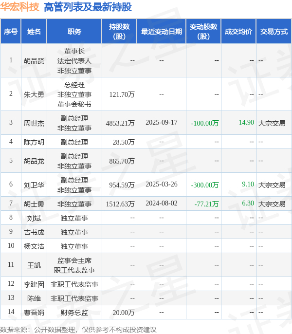 华宏科技的高管列表及最新持股情况如下: