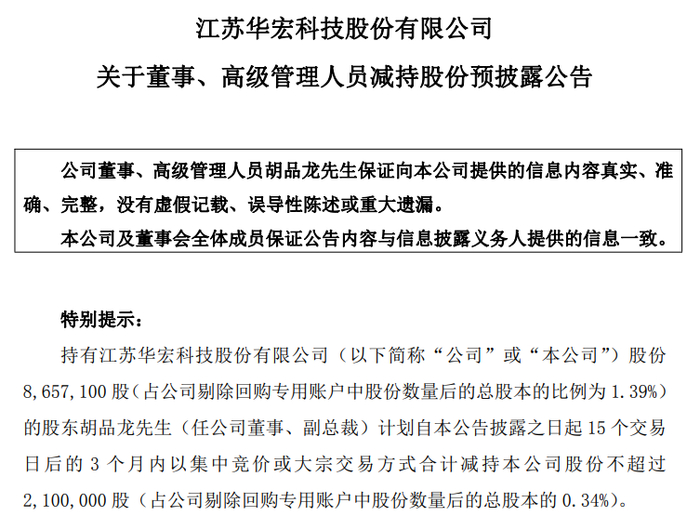 11月8日,华宏科技(002645.SZ)发布公告,公司股东胡品龙先生(任公司董事、副总裁)计划自本公告披露之日起15个交易日后的3个月内以集中竞价或大宗交易方式合计减持公司股份不超过210万股(占公司剔除回购专用账户中股份数量后的总股本的0.34%)。