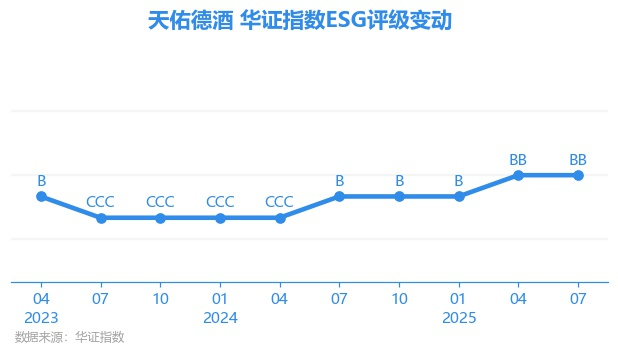日前,华证指数公布了新一期(2025年7月31日)的ESG评级结果,天佑德酒(002646.SZ)获得BB评级(华证指数评级为C起至AAA九档,C为最低档,AAA为其最高一级评级/AA为其第二档),上一期(2025年4月30日)ESG评级为BB。本期ESG评级在50家饮料行业A股上市公司中排名第26(上一期排名第28)。