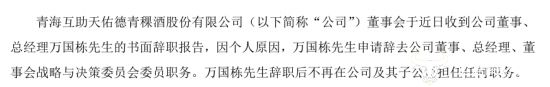 公告显示,因个人原因,公司董事、总经理万国栋申请辞职,并不再在公司及其子公司担任任何职务。截至目前,天佑德酒还未公布总经理职位的新任人选,而公司现有冯声宝、郭春光、范文丁三位副总经理,曾分别分管技术、财务、销售领域,不知新任总经理人选是否会在他们三人中产生。