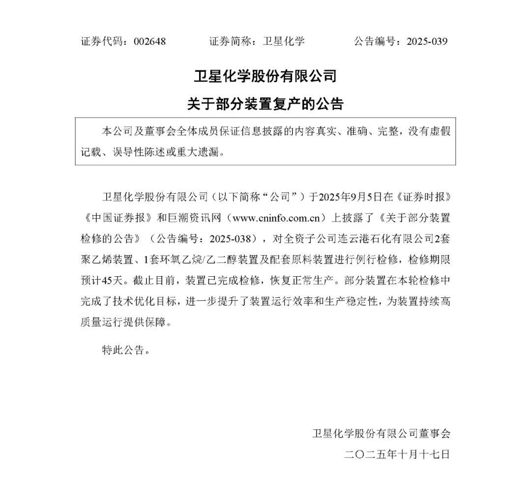 卫星化学股份有限公司于2025年9月5日,对全资子公司连云港石化有限公司2套聚乙烯装置、1套环氧乙烷/乙二醇装置及配套原料装置进行例行检修,检修期限预计45天。