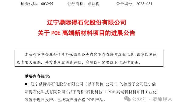 当前进展:2025年9月10日首船4887吨乙烯顺利接卸,标志进入投料开车倒计时;10月17日消息,POE高端新材料项目工业化装置于近日投产,已成功产出合格POE产品