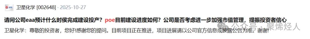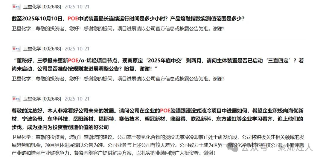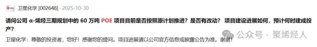 卫星化学表示,公司POE产品正在加快推进,各个牌号的样品都在测试,具体进展请关注公司官方信息或披露公告。