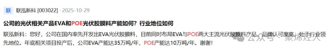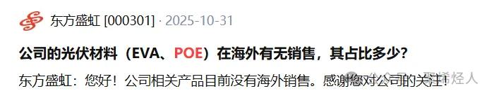 最新消息:10月31日,在投资者互动平台答投资者问时表示,公司光伏材料(EVA、POE)等相关产品目前没有海外销售
