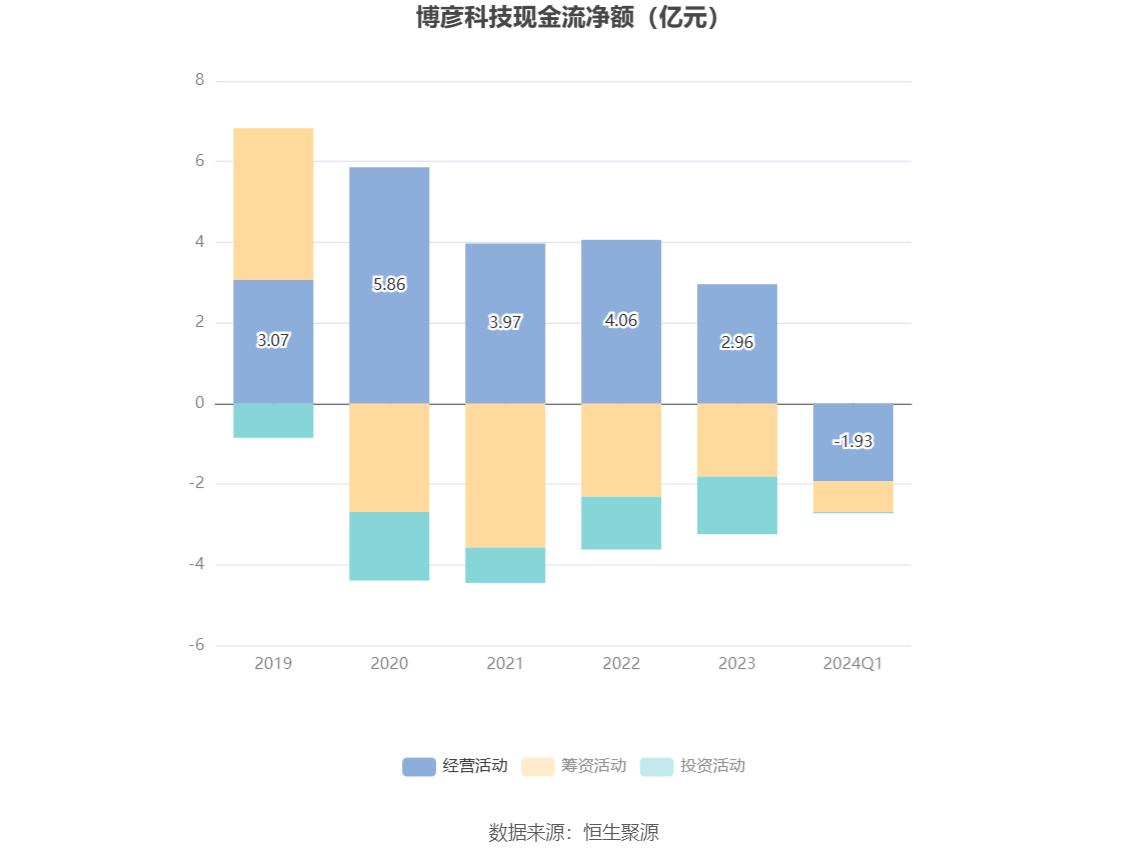 2024年第一季度,公司经营活动现金流净额为-1.93亿元,同比减少1.05亿元,主要系本期支付采购款和其他经营费用增加所致;筹资活动现金流净额-7584.62万元,同比减少6143.19万元,主要系本期偿还银行借款所致;投资活动现金流净额-301.38万元,上年同期为-1071.49万元,主要系海外子公司本期购买债券所致。