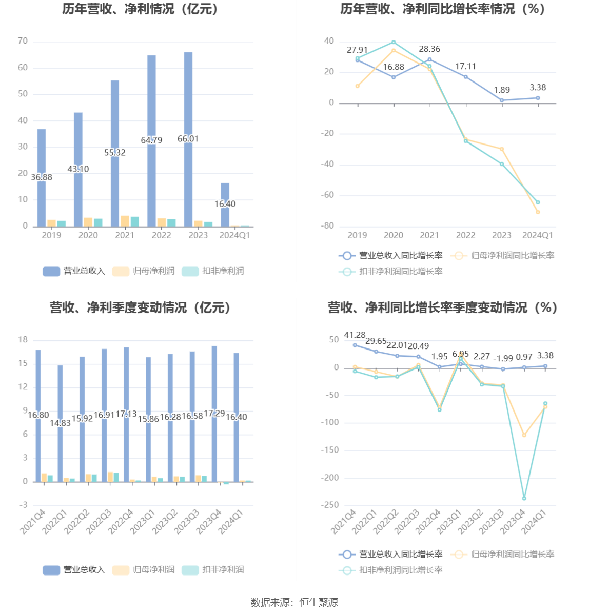 2024年第一季度,公司毛利率为21.36%,同比下降1.28个百分点;净利率为1.11%,较上年同期下降3.03个百分点。