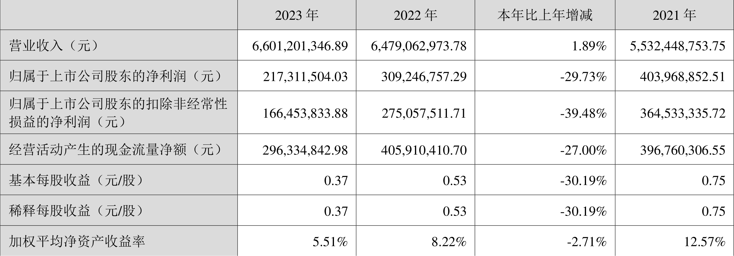2023年,公司经营活动现金流净额为2.96亿元,同比下降27.00%;筹资活动现金流净额-1.81亿元,同比增加4934.60万元;投资活动现金流净额-1.43亿元,上年同期为-1.31亿元。