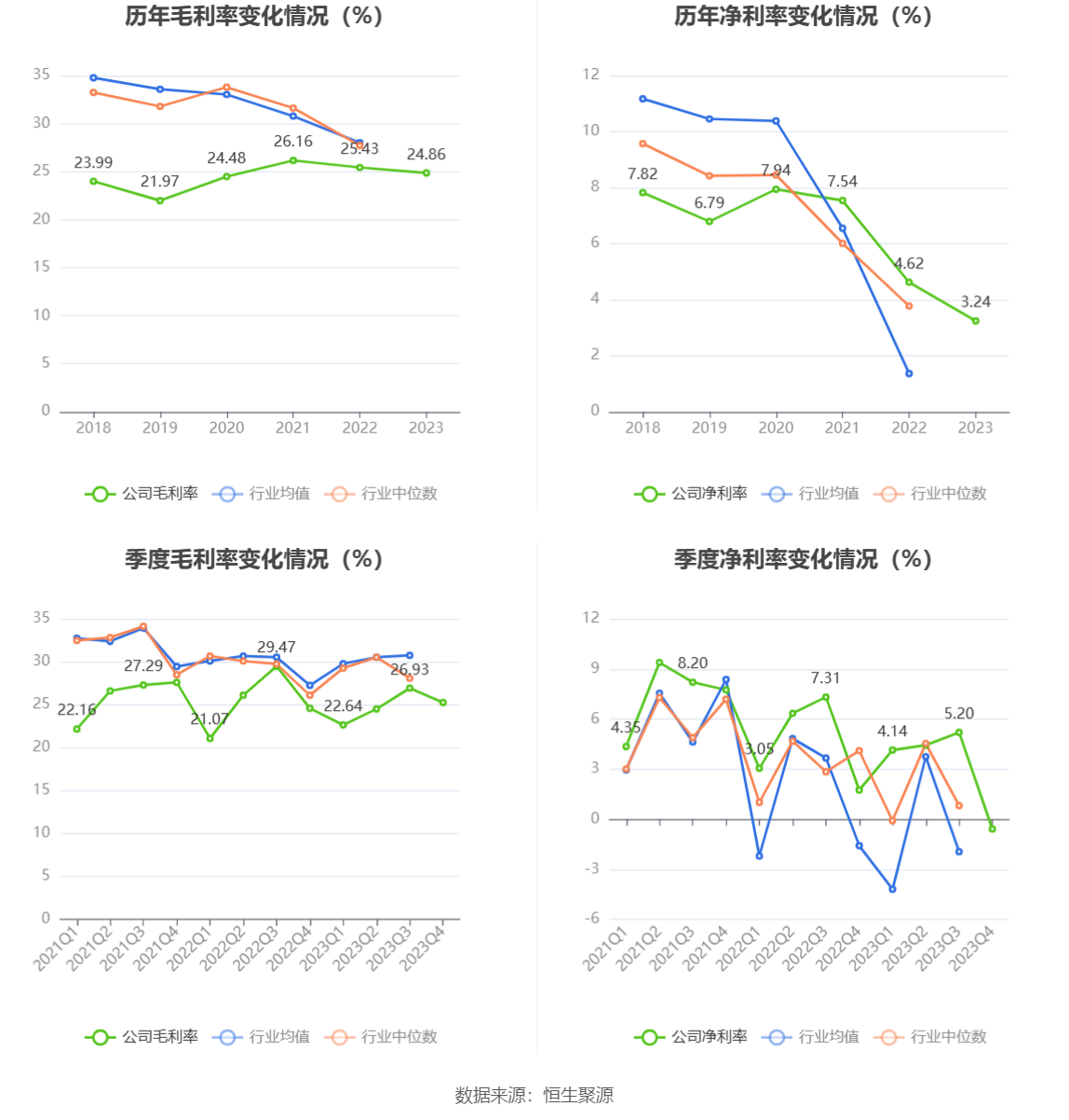 2023年,公司毛利率为24.86%,同比下降0.57个百分点;净利率为3.24%,较上年同期下降1.38个百分点。从单季度指标来看,2023年第四季度公司毛利率为25.25%,同比上升0.67个百分点,环比下降1.68个百分点;净利率为-0.59%,较上年同期下降2.33个百分点,较上一季度下降5.79个百分点。